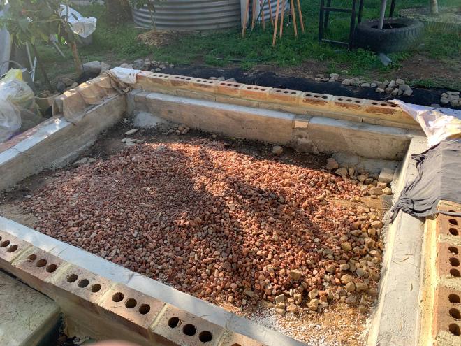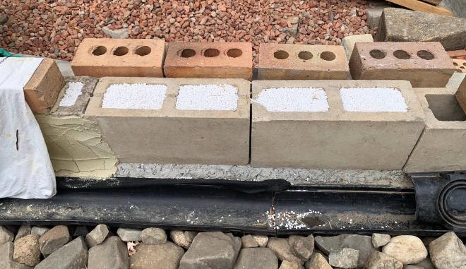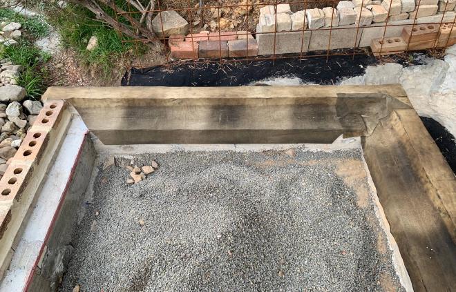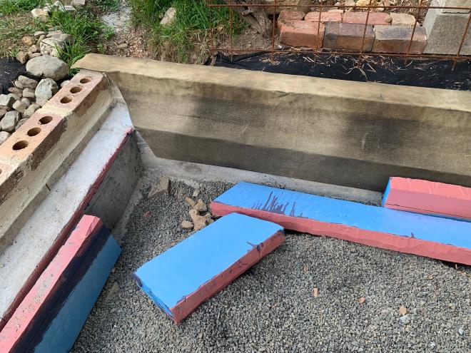 Once the outer blocks were laid, I set up formwork and rebar to pour the inner concrete layer. This is where the timber frame will sit. I also laid a course of bricks on top of the blocks to reach the final height of the stem wall.