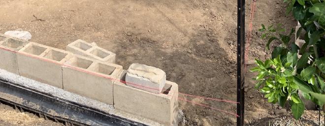 I started by setting out the site and laying concrete blocks for the outer layer of the foundation. (The concrete blocks were left over from my house build.)