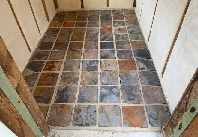 As I went, I embedded slate tiles into the limecrete / mortar. I was given these spectacular tiles by someone on my local Buy Nothing group!