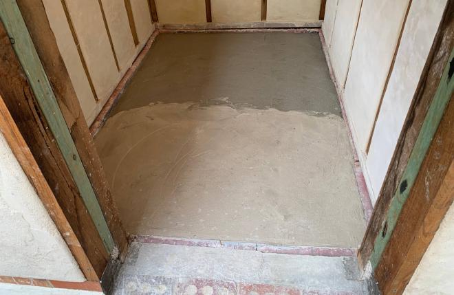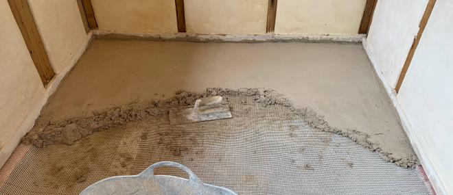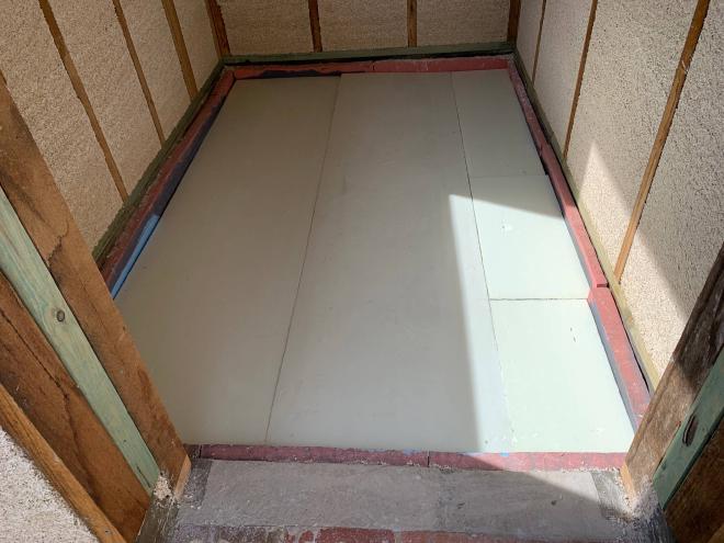 Over the XPS was a layer of cement and sand at a thickness of 30-40mm, and with a fibreglass mesh embedded. The only reason I used cement here is to make up the thickness of the floor which is otherwise made of lime… a fully lime slab at the total thickness of ~70mm would take forever to set. Cement sets well enough in 1-2 days.
